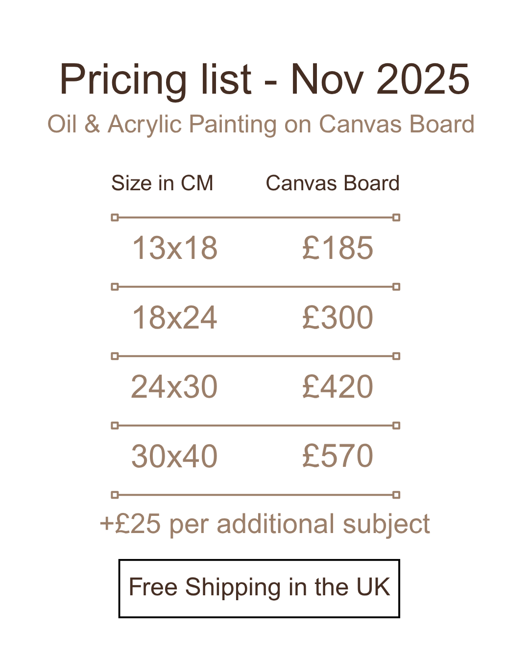 My work is completed on canvas board for paintings in oil & acrylic or thick paper for drawings & watercolour